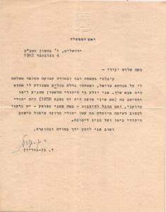 The letter presented here is an original document from 1962, written in Jerusalem and signed in the hand of David Ben-Gurion. What makes it especially powerful is that it was written on official Prime Minister of Israel stationery, bearing the State emblem at the top and the title: “Prime Minister”.