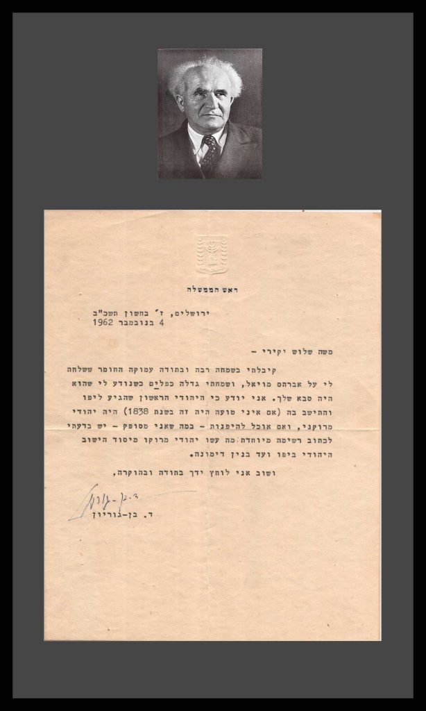 Ben-Gurion signed letter, David Ben-Gurion autograph, Ben Gurion Prime Minister letterhead, Ben Gurion official letter 1962, Israel Prime Minister signed document, Zionist historical manuscript, Zionist leaders autograph, early Jewish settlement in Jaffa 1838, Moroccan Jews in Jaffa, Sephardic Zionism before Herzl, Mizrahi Jewish history collectible, Moshe Shelush letter, Avraham Moyal historical letter, Neve Tzedek founding families, early Jaffa Jewish community, pre-First Aliyah settlement, rare Israel historical letter, Israeli political ephemera, Israel founding era documents, authentic signed Ben-Gurion letter for sale, Jewish history archive document, Zionist ephemera collectible